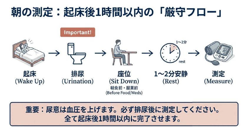 A. どちらも重要ですが、特に「朝」は大切です。 朝の血圧は、睡眠の質や前日のストレス、生活習慣の影響が色濃く反映されます。朝の血圧が高い状態(早朝高血圧)は、心血管疾患のリスクが高いと言われているため、同じ条件で継続して測る価値が非常に高いのです。