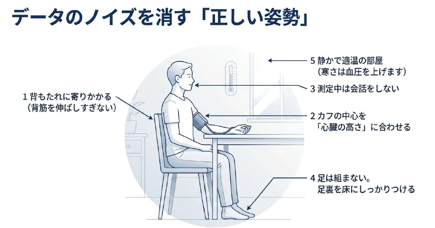 「測るたびに数値がバラバラで、どれを信じればいいかわからない」と悩む方は多いですが、血圧は動いたり、考え事をしたりするだけで変動する繊細なものです。だからこそ大切なのは、「いつも同じ条件」で測ること。以下の黄金ルールを守るだけで、データの信頼性はぐっと高まります。